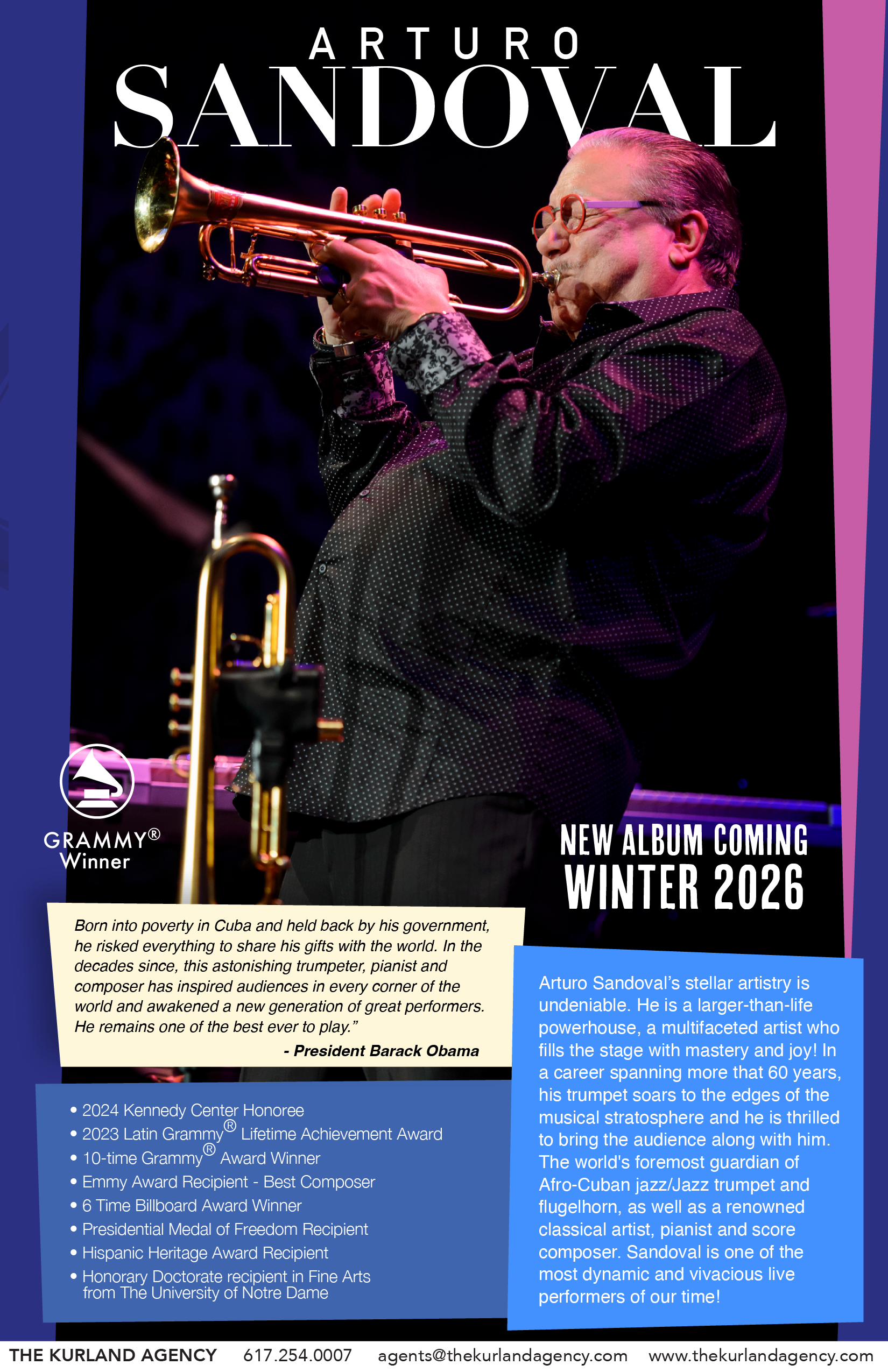 “Born into poverty in Cuba and held back by his government, he risked everything to share his gifts with the world. In the decades since, this astonishing trumpeter, pianist and composer has inspired audiences in every corner of the world and awakened a new generation of great performers. He remains one of the best ever to play.” –President Barack Obama