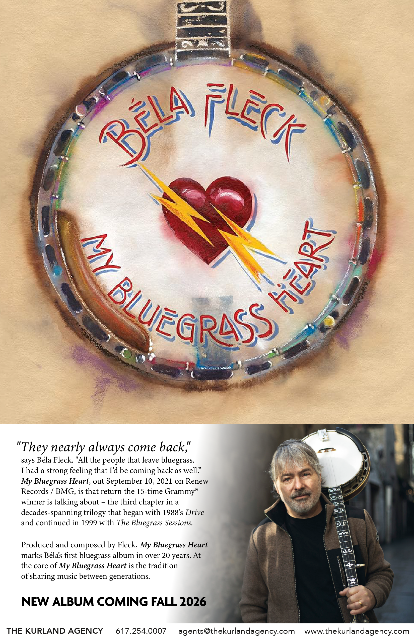 My Bluegrass Heart, out September 10, 2021 on Renew Records, is that return the 15-time Grammy winner is talking about – the third chapter in a decades-spanning trilogy which, by his counting, started with 1988’s Drive and continued with The Bluegrass Sessions, released eleven years later. Over the long and lauded course of his unique creative run, Fleck – the world’s premier banjo virtuoso and a celebrated musical adventurer – has both dug deep into his instrument’s complex global history and unlocked the breadth of its possibilities. My Bluegrass Heart is a homecoming in sound, to be sure.