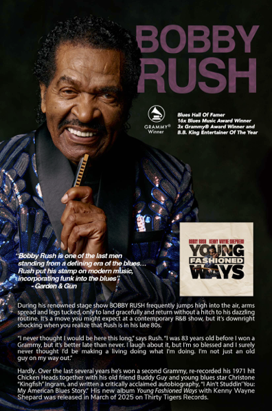 The 92-year-old BOBBY RUSH is a three-time Grammy® Award winner for “Best Traditional Blues Album” for “Porcupine Meat,” “Rawer than Raw” and 2024’s “All My Love For You.” He is also a 16-time Blues Music Awards winner (with 56 career nominations), and has been inducted into the Blues Hall of Fame, Mississippi Musicians Hall of Fame and Rhythm & Blues Hall of Fame.