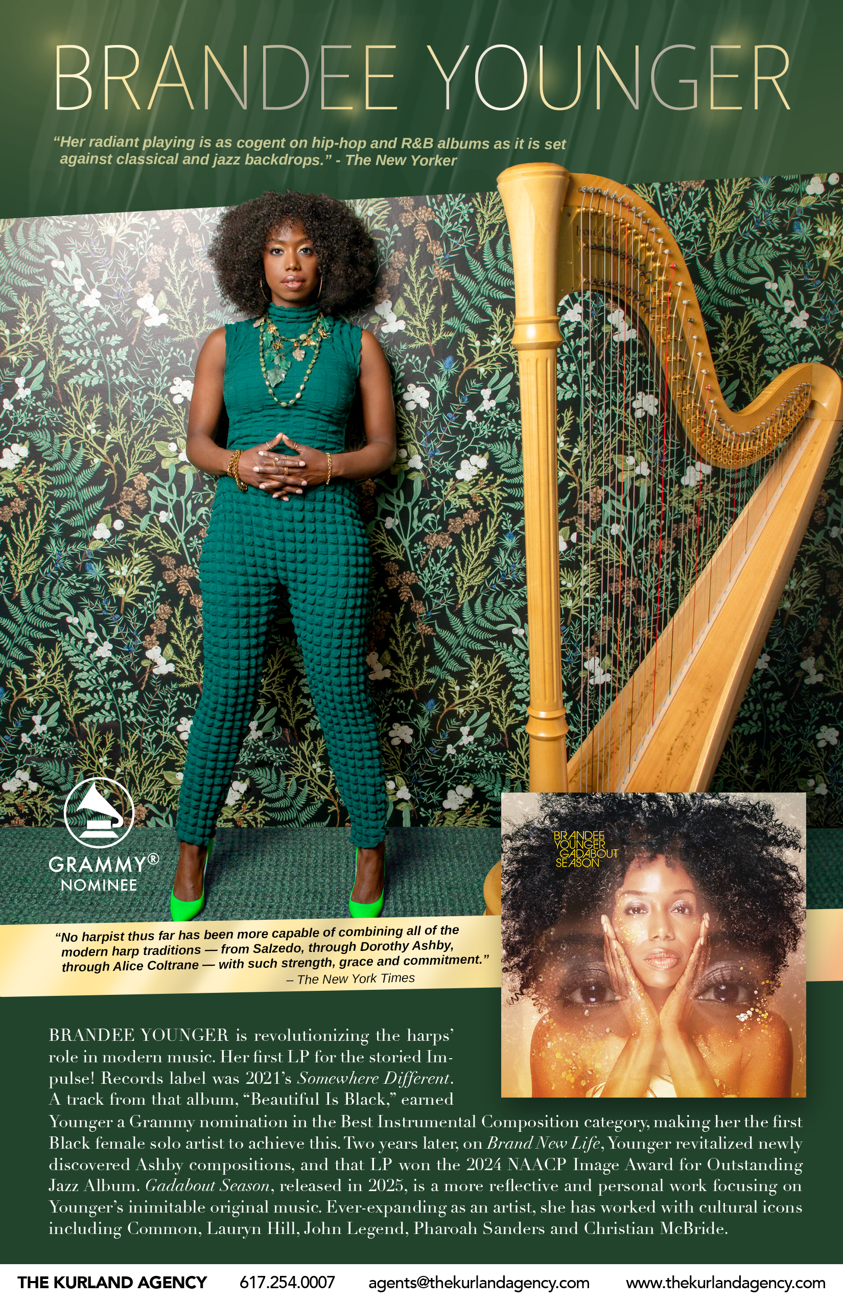 BRANDEE YOUNGER is revolutionizing the harps’ role in modern music. Over the past fifteen years, she has worked relentlessly to stretch boundaries and limitations for harpists. In 2022, she made history by becoming the first Black woman to be nominated for a Grammy® Award for Best Instrumental Composition. That same year, she was also nominated for an NAACP Image Award and later, the winner of the 2024 NAACP Image Award in the category of Outstanding Jazz Album for her latest album Brand New Life. Ever-expanding as an artist, she has worked with cultural icons including Common, Lauryn Hill, John Legend, Pharoah Sanders and Christian McBride.