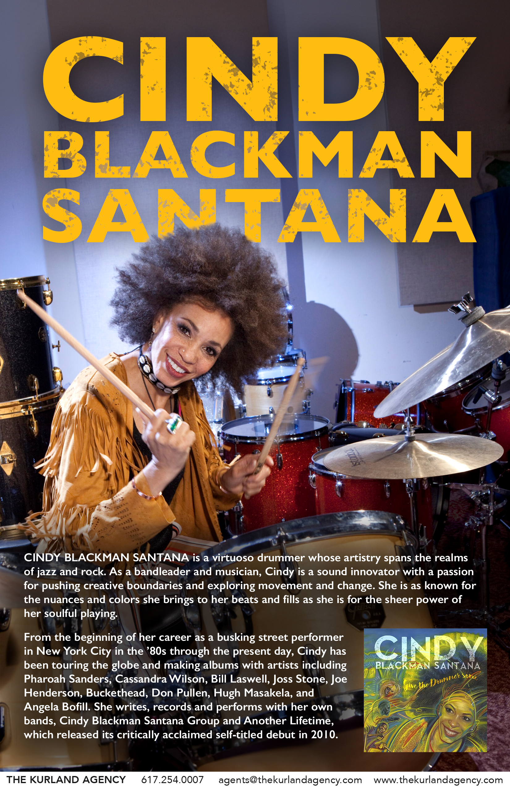 CINDY BLACKMAN SANTANA is a virtuoso drummer whose artistry spans the realms of jazz and rock. As a bandleader and musician, Cindy is a sound innovator with a passion for pushing creative boundaries and exploring movement and change. She is as known for the nuances and colors she brings to her beats and fills as she is for the sheer power of her soulful playing.