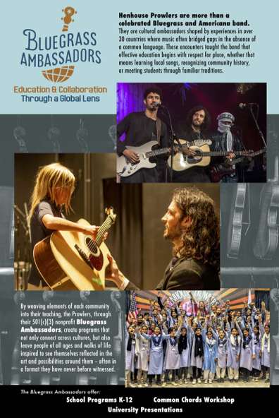 To date, the Prowlers have toured 30 countries on 5 continents working with the U.S. State Dept and their own nonprofit, BLUEGRASS AMBASSADORS. The group’s many life-changing encounters with people and musicians across the globe have shaped their worldview and bolstered the bridges they establish between cultures. Through workshops, presentations, and a forthcoming documentary, they spread the familiarities discovered in unsuspecting corners of the world and are committed to broadcasting what they are certain of: we have more in common than we don’t. Time and time again, music demonstrates that when we focus on love, beautiful connections can sprout.