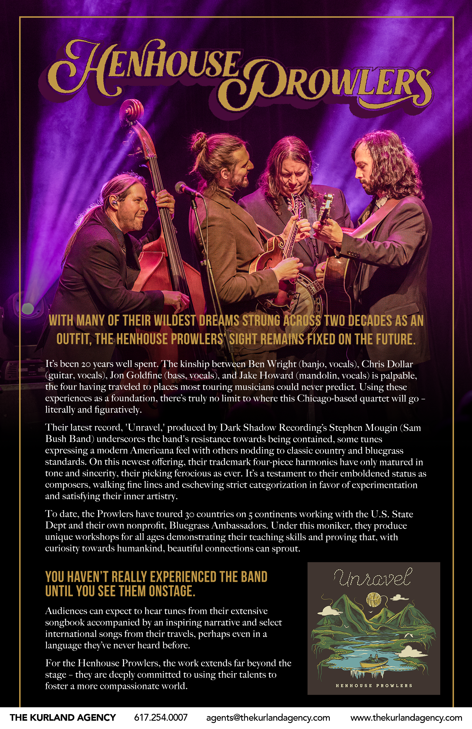 Ever constant in the group’s enthralling performances is their ability to showcase their passion for both their craft and our shared humanity. Each member skilled in storytelling, compelling songwriting and intricate instrumentation, they fervently build on one another’s raw talent, always finding a way to deeply connect with their audiences. Their curiosity and innovation lands the Prowlers in a category difficult to define but explosively intriguing around every bend.