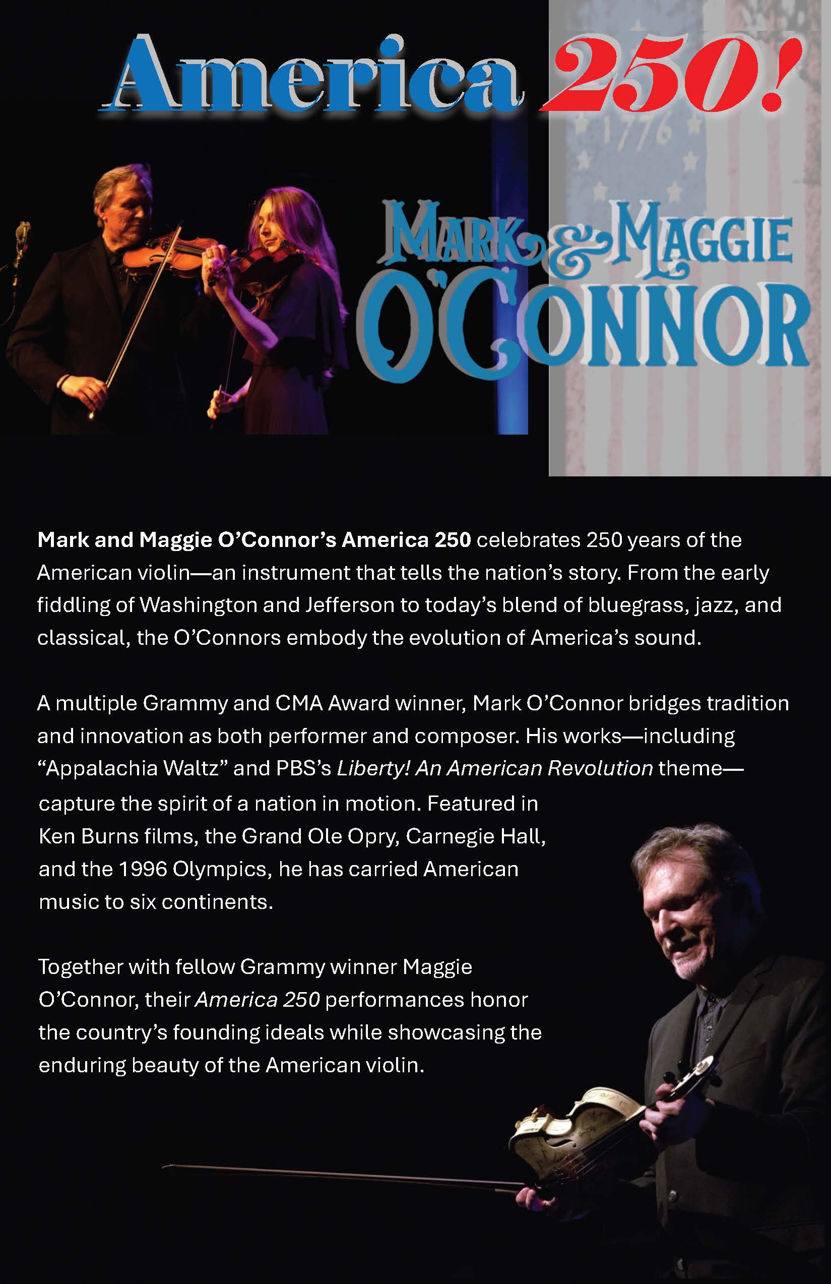 MARK O’CONNOR began his creative journey at the feet of American fiddling legend Benny Thomasson, and the iconic French jazz violinist Stéphane Grappelli. Now, at age 59, he has melded these influences into a new American classical music, and is perpetuating his vision of an American School of String Playing. Mr. O’Connor has won three Grammys, seven CMA awards as well as several national fiddle, guitar and mandolin champion titles. His distinguished career includes representing the United States Information Agency in cultural diplomacy to six continents and performing in front of several U.S. presidents including being invited to the White House by President Ronald Reagan to perform as a teen.