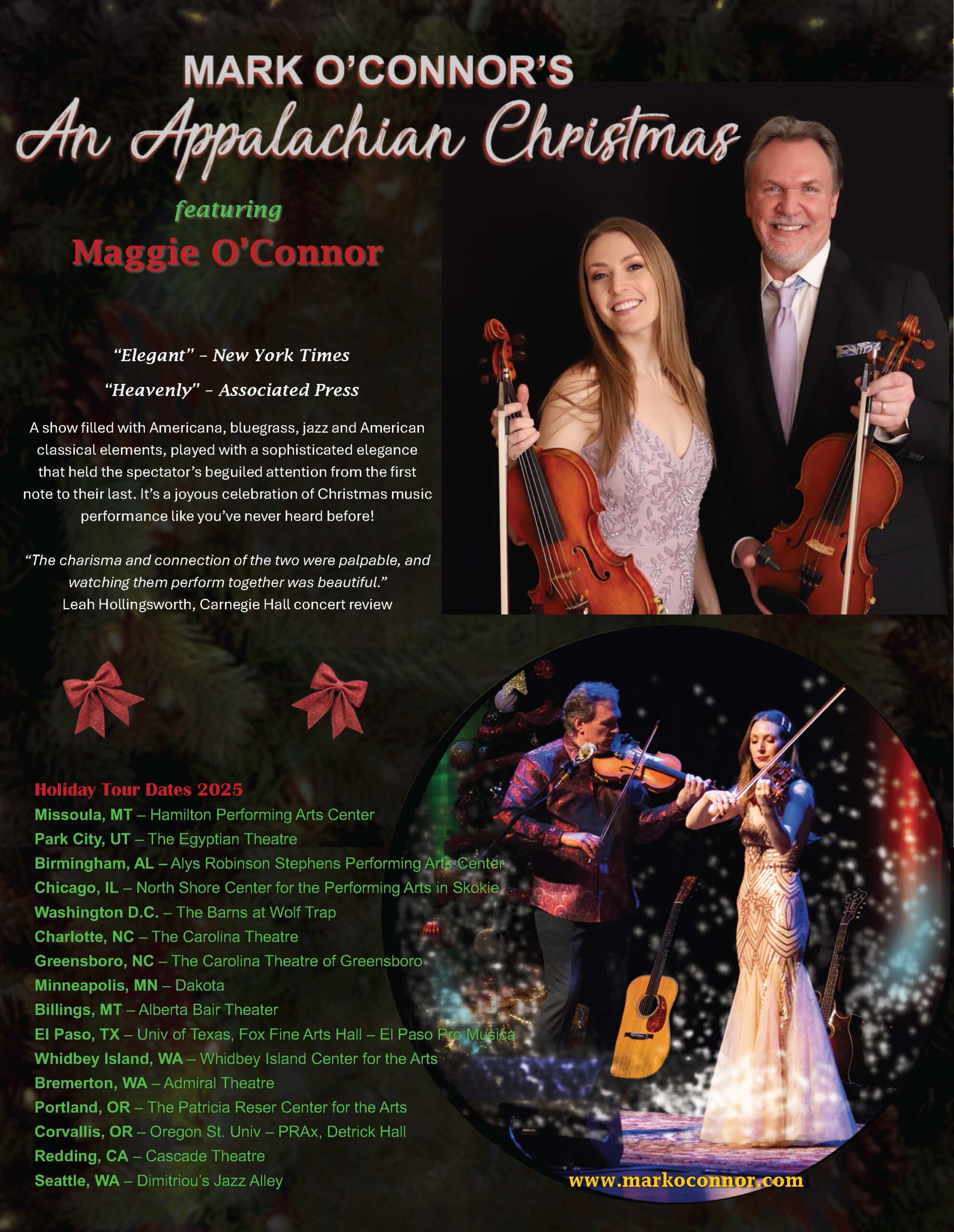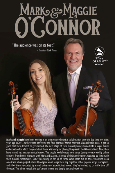 Mr. O’Connor has authored a series of educational books called the O’Connor Method and is now the fastest growing violin method in the country and tens of thousands can credit the O’Connor books for learning how to play stringed instruments. The O’Connor Method features American music styles, creativity, cultural diversity and western classical technical training. Mr. O’Connor regularly tours with his wife Maggie who is a violinist and vocalist. Mark and Maggie O’Connor perform violin and fiddle duos, guitar and mandolin with vocals featuring music from their recent album, Life After Life and Mr. O’Connor’s perennial An Appalachian Christmas. Together they also perform his original concertos and suites with symphony orchestras. Mr. and Mrs. O’Connor reside in North Carolina. For more information, please see www.markoconnor.com and www.oconnormethod.com.