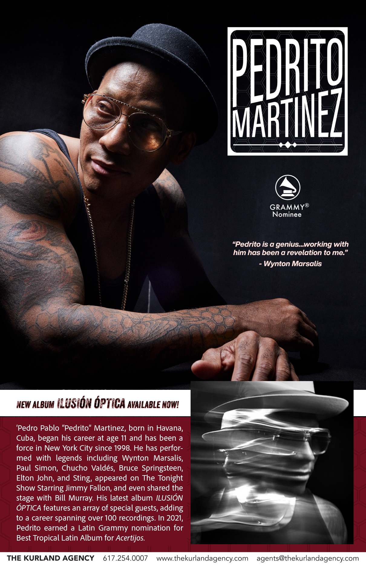 In 2021, Pedrito recorded two singles and has performed, with Cuban superstar, Camila Cabello. He was awarded Percussionist of The Year by JazzTimes Magazine Critics Poll. A 2021 album called Acertijos (Riddles), featuring primarily original compositions, and special guests, Gilberto Santa Rosa, Eric Clapton, and Issac Delgado, was nominated for a Latin Grammy, for Best Contemporary Tropical Album of 2021.