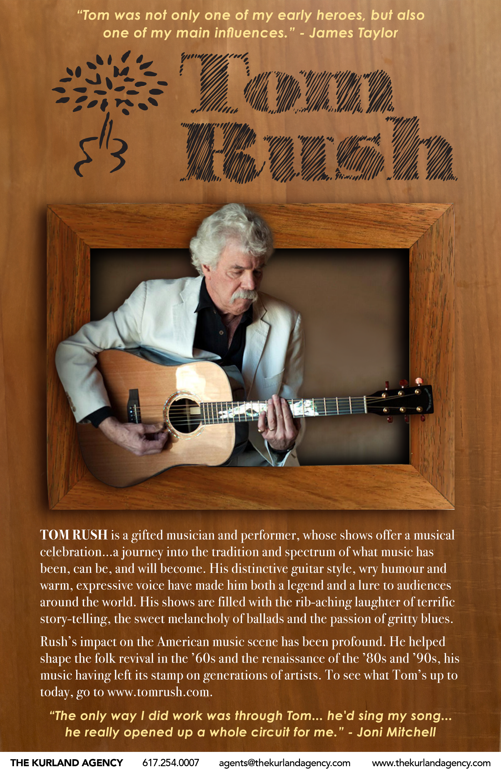 TOM RUSH is a gifted musician and performer, whose shows offer a musical celebration…a journey into the tradition and spectrum of what music has been, can be, and will become. His distinctive guitar style, wry humour and warm, expressive voice have made him both a legend and a lure to audiences around the world. His shows are filled with the rib-aching laughter of terrific story-telling, the sweet melancholy of ballads and the passion of gritty blues.
